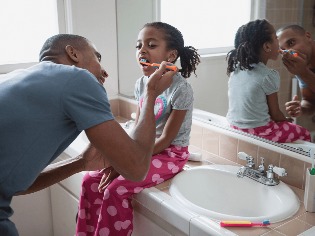 Spend some time teaching your child how to brush each surface of their teeth—the front and the back. Use a soft-bristled brush appropriate for their age. Set a timer for 2 minutes and encourage your child to use the full two minutes to brush. This prevents them from rushing and doing it poorly. When your child’s teeth start to touch, teach your child to gently floss in the evenings to clear away the day’s debris.